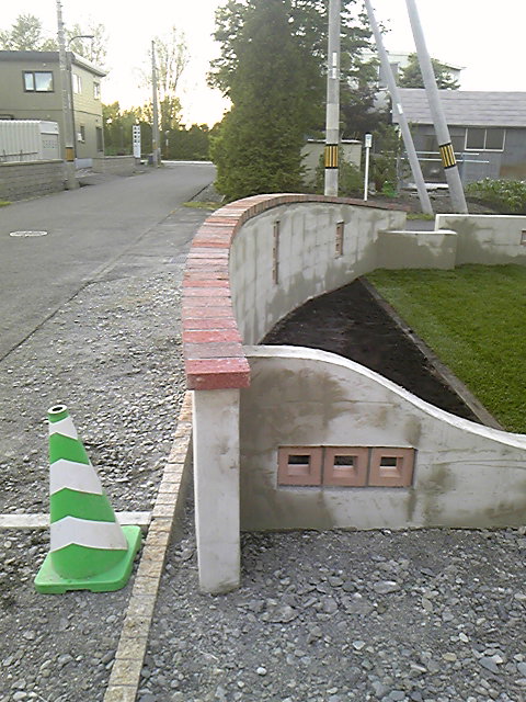 実は平面的、立面的共に単曲線で表現される塀にレンガ笠を積む作業をしておりました。