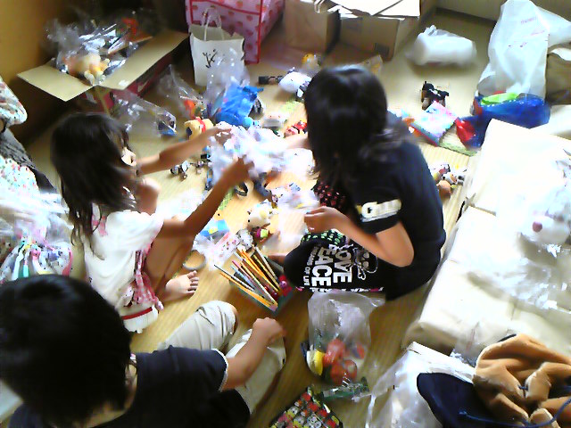 真新しいオモチャや日用品、、はたまたセブンイレブン北2条店、ローソン北3条店、スパー北3条店の3件からもオヤツなどなどが盛りだくさんに集まって、普段は何もなくガラガラの「外屋」事務所2階は”あっ”と言う間にモノだらけ・・