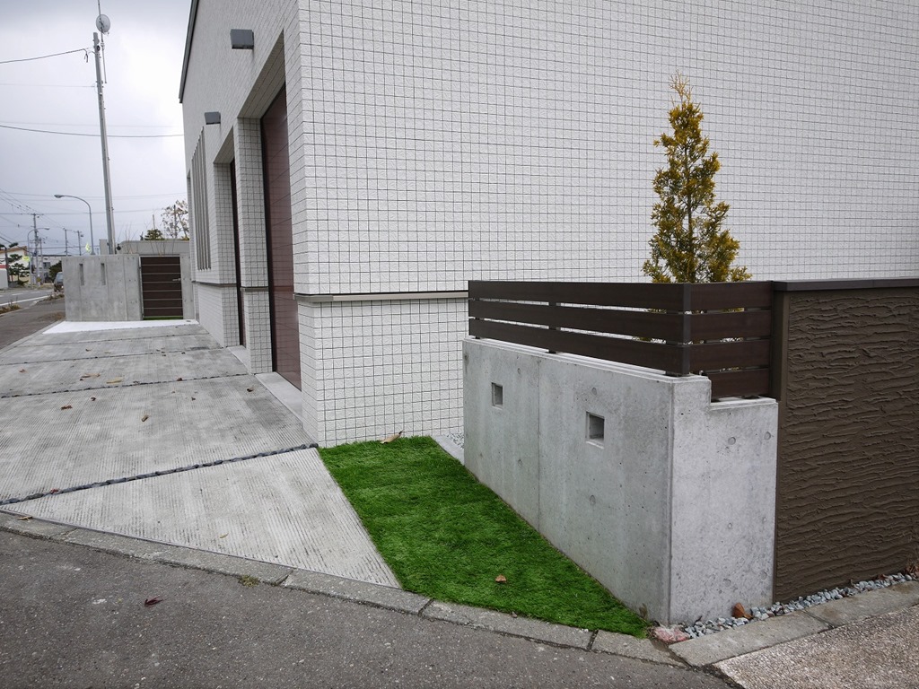二軒にまたがって設置されている塀につき、もう一軒の方は若々しさを演出するために、住宅サッシ部のアーバングレー色に合わせたモダンデザインとしています。