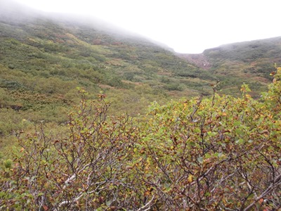 上だけ雨具を付けて、新道から下山しました。何度振り返っても、斜里岳は雲の中でした。