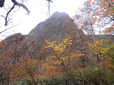 ここから雨が強くなり、全員雨具を着けて広い尾根を気楽に下山しました。ガスの為、紅葉はほとんど楽しめませんでした。