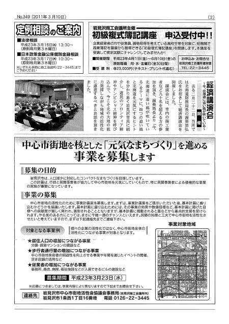以前にもご紹介していますが、“岩見沢商工会議所だより”の3月号に、中心市街地を核とした「元気なまちつ゛くり」を進める事業を募集しますという記事が載っています。対象となる事業例として紹介されている賃貸マンションには、弊社で取り組んでいるユーミーマンションが合致します。ご興味がある方は、弊社まで是非ご連絡ください。