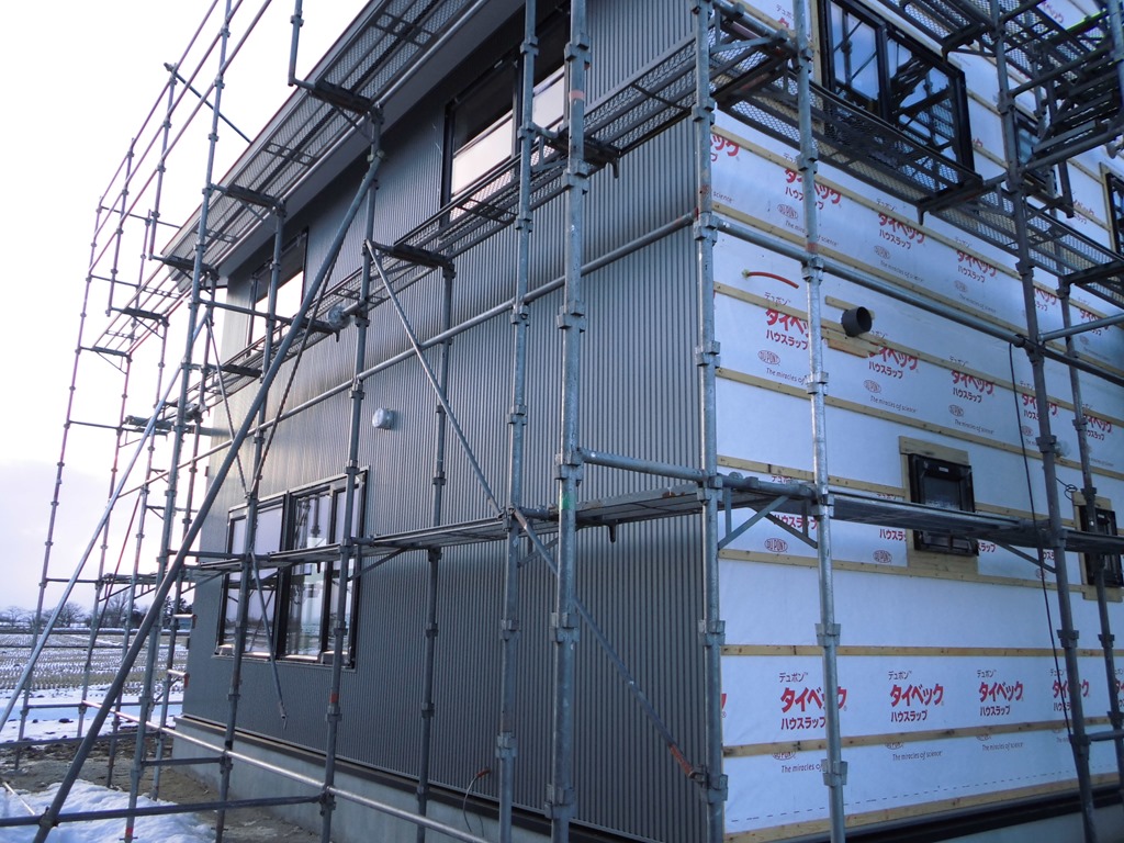| 壁に防湿気密シートを貼っています。弊社はアルミ 蒸着の日本住環境㈱のダンシーツを使用していま す。 | 外部では外壁工事にかかっています。 |