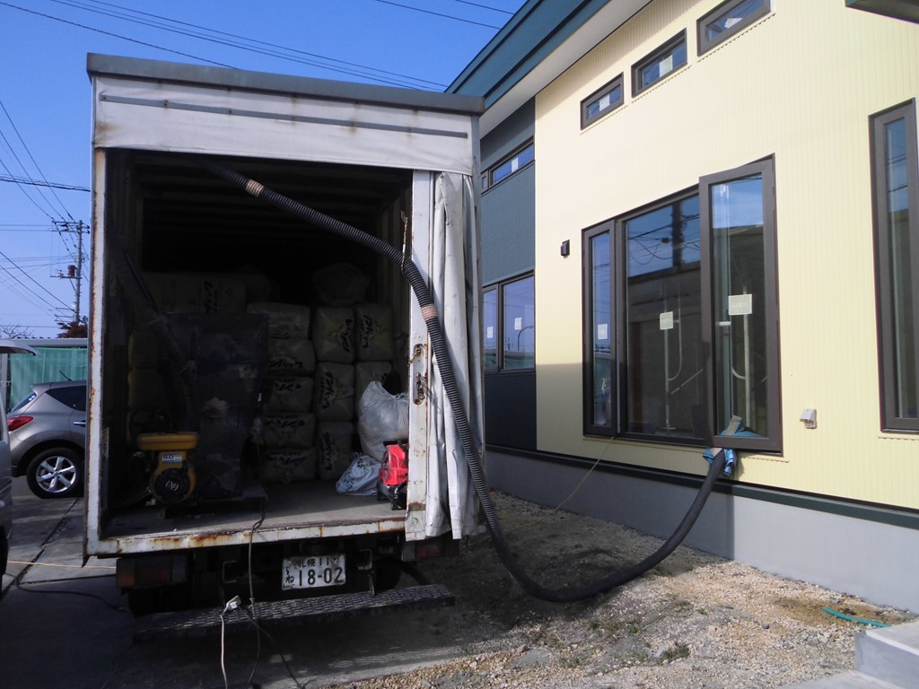 天井の断熱工事も行っています。セルローズファイバーを吹き込んでいます。
