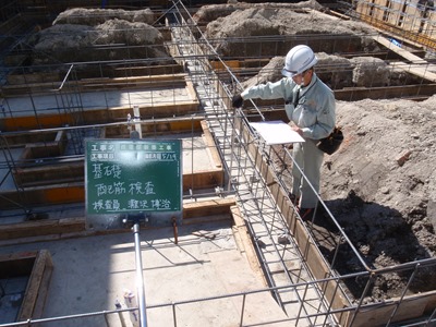 基礎の配筋が完了したので、検査員による配筋検査を行います。