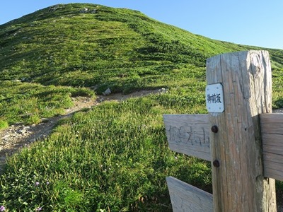 本日も快晴、砂礫地を横切り沢形を登っていくと1908mの草履塚です。ここから飯豊山神社の境内だそうです。